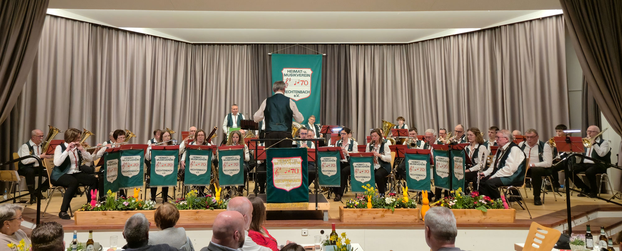 Schon beim Betreten des Bürgerhauses Rechtenbach wurde klar: Dieser Abend würde etwas Besonderes werden. Liebevoll dekorierte Tische und eine festlich geschmückte Bühne mit zahlreichen Frühlingsblumen sorgten für eine einladende Atmosphäre und stimmten das Publikum perfekt auf das Frühlingskonzert des Heimat- und Musikvereins 70 Rechtenbach e.V. ein.